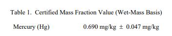 表 1 中提供了汞的認(rèn)證值,表示為基于濕質(zhì)量(原樣)的質(zhì)量分?jǐn)?shù) [1]。該值基于使用冷蒸氣同位素稀釋的主要方法進(jìn)行的分析電感耦合等離子體質(zhì)譜 (CV-ID-ICP-MS) [2,3]。 NIST 認(rèn)證值是 NIST 對其準(zhǔn)確性具有最高置信度的值,因?yàn)樗幸阎蚩梢傻钠顏碓炊家驯徽{(diào)查或考慮 [4]。認(rèn)證值的不確定度以擴(kuò)展不確定度的形式給出,以大約 95% 的置信度覆蓋被測量。擴(kuò)展的不確定性計(jì)算為 U = kuc 其中uc 是與 ISO/JCGM 指南 [5] 一致的組合不確定度,k 是對應(yīng)于大約 95% 置信度的覆蓋因子 (k = 2)。被測量是表 1 中列出的汞的總質(zhì)量分?jǐn)?shù)。計(jì)量可溯源至 SI 派生的質(zhì)量分?jǐn)?shù)單位(以毫克每千克表示)