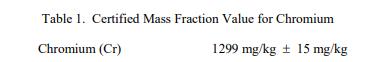 表 1 中提供了基于干質(zhì)量報(bào)告的鉻 (Cr) 認(rèn)證質(zhì)量分?jǐn)?shù)值。NIST 認(rèn)證值是 NIST 對(duì)其準(zhǔn)確性有最高置信度的值已知或可疑的偏倚來(lái)源已被調(diào)查或考慮 [1]。 Cr 的認(rèn)證值計(jì)算為方差加權(quán)平均值,基于使用 NIST [2] 標(biāo)準(zhǔn)添加方法校準(zhǔn)的電感耦合等離子體質(zhì)譜 (ICP-MS) 獲得的平均值,并提供單個(gè)結(jié)果的加權(quán)平均值由附錄 A 中列出的合作實(shí)驗(yàn)室提供。