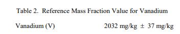表 2 提供了釩 (V) 的參考質(zhì)量分?jǐn)?shù)值,以干質(zhì)量為基礎(chǔ)報(bào)告。NIST 參考值是一個(gè)未經(jīng)認(rèn)證的值,它是基于可用的真實(shí)值的最佳估計(jì)數(shù)據(jù);但是,這些值不符合 NIST 認(rèn)證標(biāo)準(zhǔn),并提供不確定性,所有已知或可疑的偏差來(lái)源尚未得到充分調(diào)查[1]。 V 的參考值基于使用標(biāo)準(zhǔn)添加方法校準(zhǔn)的單一 NIST 方法 (ICP-MS) 獲得的平均值。